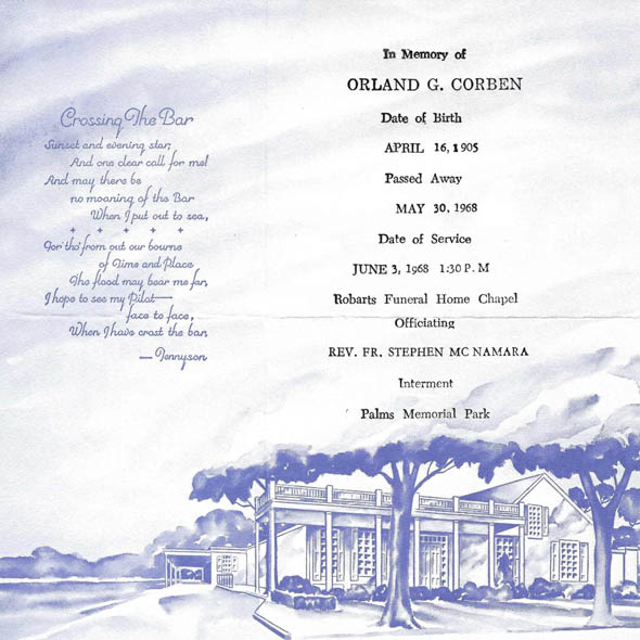 May 30, 1968 - Mr. Corben dies in Sarasota, FL at the age of 64. According to his funeral announcement, Corben was only 63. [11]